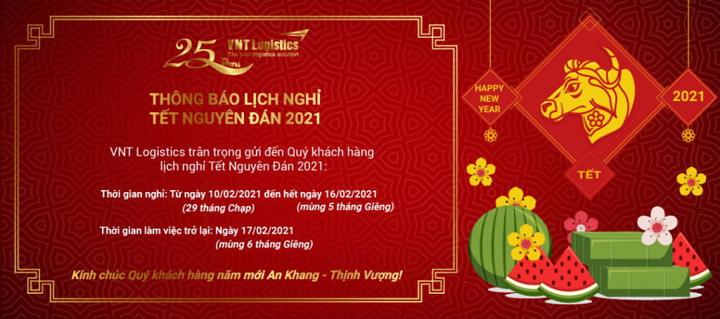VNT Logistics trân trọng gửi đến Quý khách hàng lịch nghỉ Tết Nguyên Đán 2021: Thời gian nghỉ: Từ ngày 10/02/2021 (29 tháng Chạp) đến hết ngày 16/02/2021 (mùng 5 tháng Giêng). Thời gian làm việc trở lại: Ngày 17/02/2021 (mùng 6 tháng Giêng). Kính chúc Quý khách hàng năm mới An Khang – Thịnh Vượng!